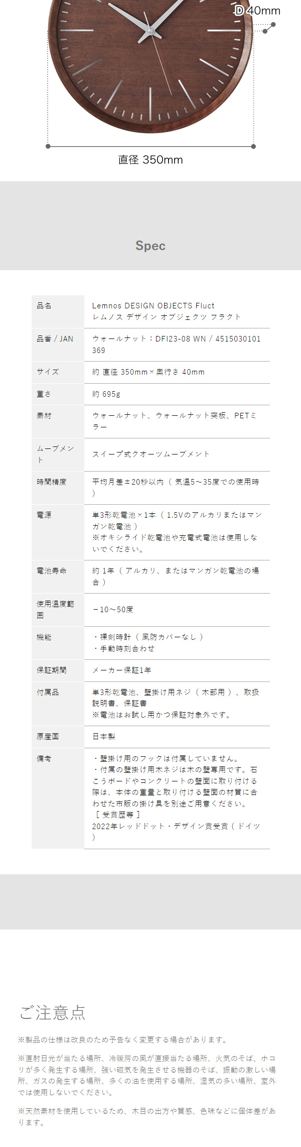 “ 品格 ”をテーマにデザインされた高級感のある掛け時計『 Lemnos フラクト 』。鏡面仕上げのバーインデックスやドーフィンハンズの針など素材と質感の表現にこだわり、時と共に移ろう変化を感じさせます。静音が嬉しい連続秒針で、リビングやダイニングはもちろん寝室にも置ける静かさ。天然木を用いたダークブラウンの文字盤は、直径約35cmと見やすいサイズ。インテリアにもなる存在感を放ちながら、あらゆる空間に調和するウォールクロックです。