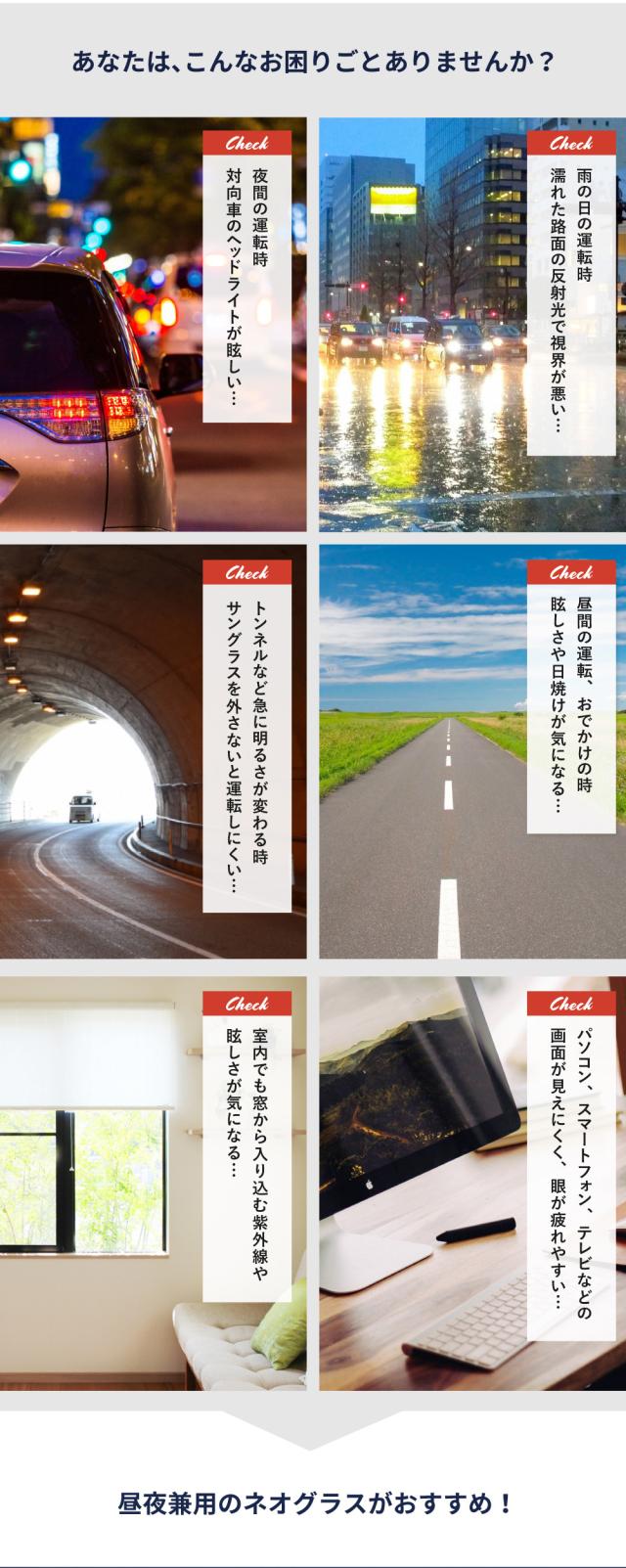 夜間、或いは雨、霧、曇りの天候の際に着用頂くことで 視認性 が良くなります。特に ドライブ の際は標識や信号、歩行者などが見やすくなります。また 夜間の運転にも効果的で、対向車の ライト 、街灯、ネオンなどの強い光を緩和する効果が期待でき、運転の安全性が高いと考えられます。もちろん、日差しの強い日中もお使い頂くことができ、眩しさを低減するとともにし 紫外線 から目を守り(UVカット率は約100%) 眼精疲労 や 眼の疲れ からくる 頭痛 も抑えられたとのお声も頂いております。