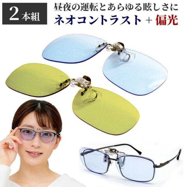 2本組 ネオコントラスト テクノロジー サングラス クリップオン【レビューでポイント10倍デー】跳ね上げ式レンズ 夜間 運転 サングラス 偏光サングラス メガネの上から サングラス UVカット メラニン 抑制 ナイト 夜用 昼夜兼用 白内障 術後 保護メガネ CLIPON2-NEO+Y75-M