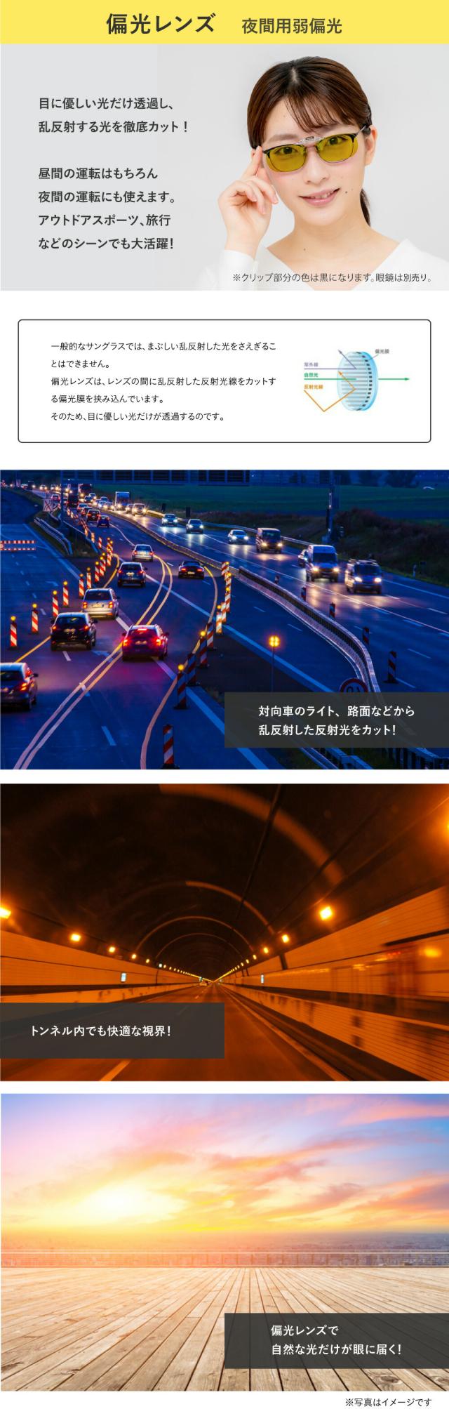 - 何度か他店で似たような商品を購入しましたが、ダントツで素晴らしい商品でした。他のクリップタイプのサングラスよりも、イエローライトカットの効果で眩しさが格段に抑えられているのを実感できました。