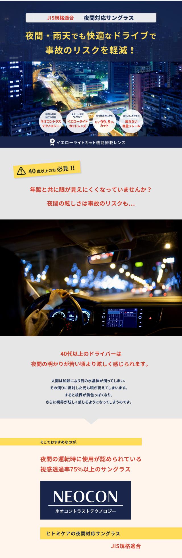 夜間、或いは雨、霧、曇りの天候の際に着用頂くことで 視認性 が良くなります。特に ドライブ の際は標識や信号、歩行者などが見やすくなります。また 夜間の運転にも効果的で、対向車の ライト 、街灯、ネオンなどの強い光を緩和する効果が期待でき、運転の安全性が高いと考えられます。もちろん、日差しの強い日中もお使い頂くことができ、眩しさを低減するとともにし 紫外線 から目を守り(UVカット率は約100%) 眼精疲労 や 眼の疲れ からくる 頭痛 も抑えられたとのお声も頂いております。