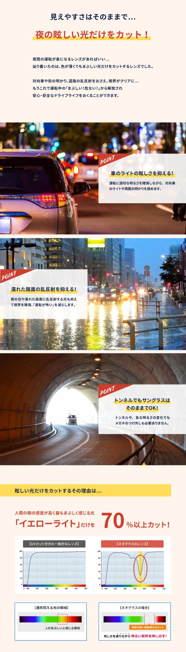 日米特許を取得した ネオグラス は、特殊技術により レンズ に技術により人が最も眩しいと感じる黄色い光の中でも585nmの波長のみを、選択的に最大70%以上カットし、眩しさを抑える効果がございます( イエローライトカット )