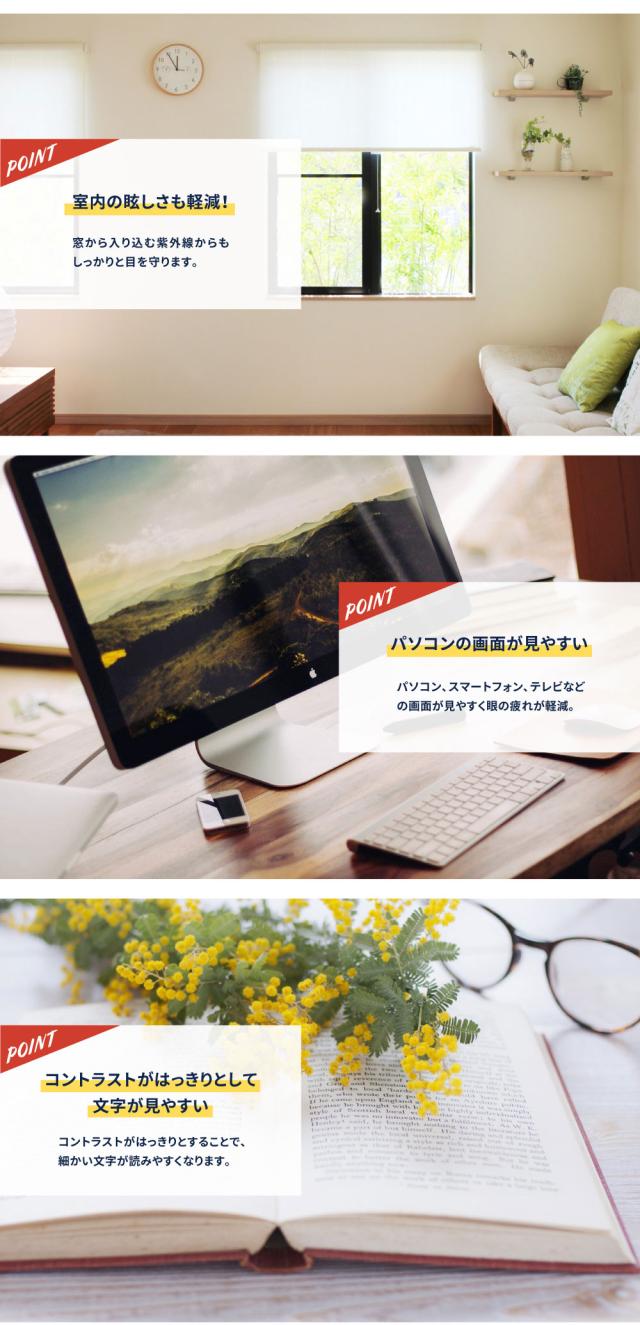 白内障を患う年齢に近づくにつれ、最も効果的に利用が可能です。日常的に感じる屋内外のまぶしさが低減され、 パソコン や スマホ の利用時にも重宝します。