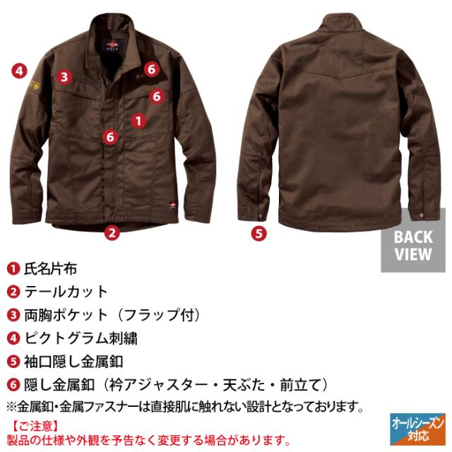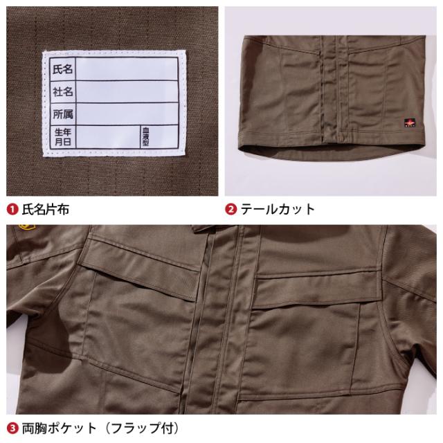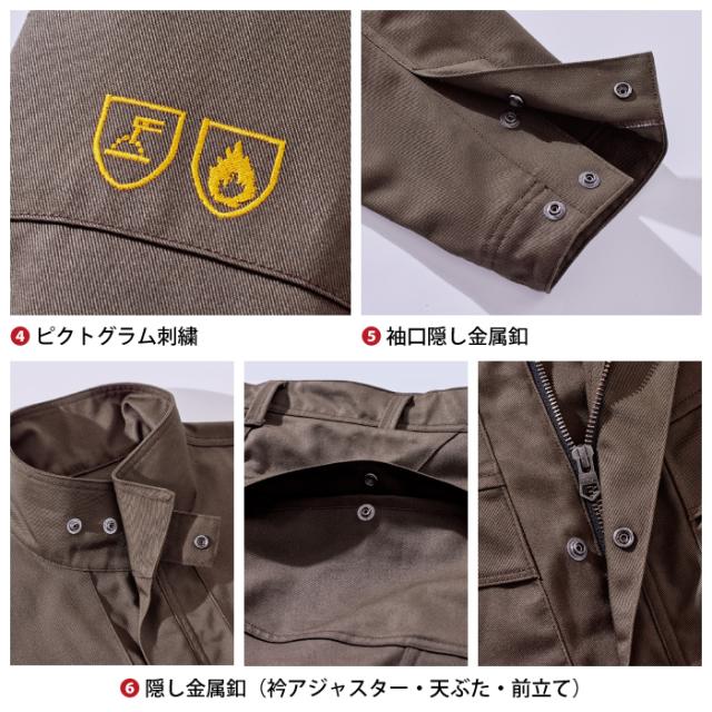 ◇機能:氏名片布・テールカット・両胸ポケット(フラップ付)・ピクトグラム刺繍・袖口隠し金属釦・隠し金属釦(衿アジャスター・天ぶた・前立て)・消臭テープ
