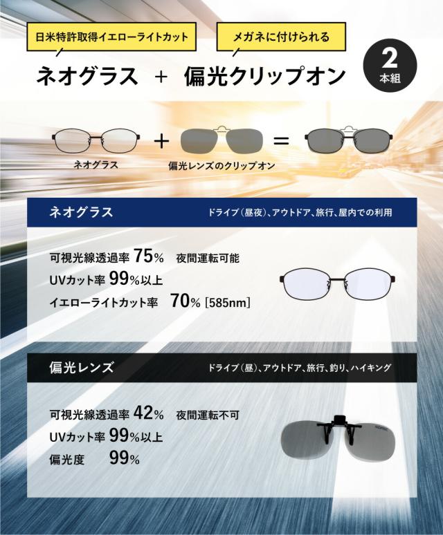 2本組 ネオコントラスト テクノロジー サングラス 【レビューでポイント10%還元】跳ね上げ式レンズ 夜間 運転 UVカット 偏光サングラス クリップオン 白内障 術後 保護メガネ メラニン 抑制 レンズ 美肌 紫外線 日焼け シミ 花粉症 花粉 対策 薄い 色 S9056B+CLIPON-GR42