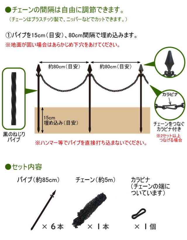 お庭の花壇や芝生、玄関までのアプローチから外れた場所などへの侵入を防止するためのチェーンと支柱のセットです! オシャレな黒のねじりパイプでお庭をより引き立て、魅力的に見えます! チェーンの長さはたっぷり5m! しっかりと仕切ることができます! また、プラチェーンなので長すぎる場合はニッパーなどで切断可能! お好きな長さでチェーンを余らせずキレイに設置できます! また2セット連結時に使えるカラビナもついています。 |