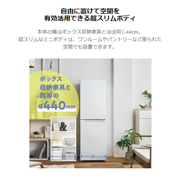 ジャイアントフリーザー / 引き出し式クリアバスケット / スリムボディ ■定格内容積:148L ■各室容量: 冷蔵室:87L [70L] 冷凍室:61L [44L] ※[ ]内の数字は食品収納スペースの目安 ■外形寸法:幅440×奥行599×高さ1,390mm ■必要設置スペース:幅540×奥行699×高さ1,490mm ※設置条件により若干異なることがありますので、10mm程度余裕をとってください。 ■質量(約):39kg ■年間消費電力量(50/60Hz):279kWh/年 ※記載は商品仕様の一部です。仕様説明不足等の理由での返品はできません。特に適合等は必ずご確認ください。