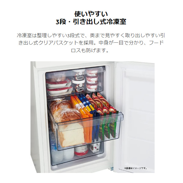 冷凍室は整理しやすい3段式で、奥まで見やすく取り出しやすい引き出し式クリアバスケットを採用。中身が一目で分かり、フードロスも防げます。