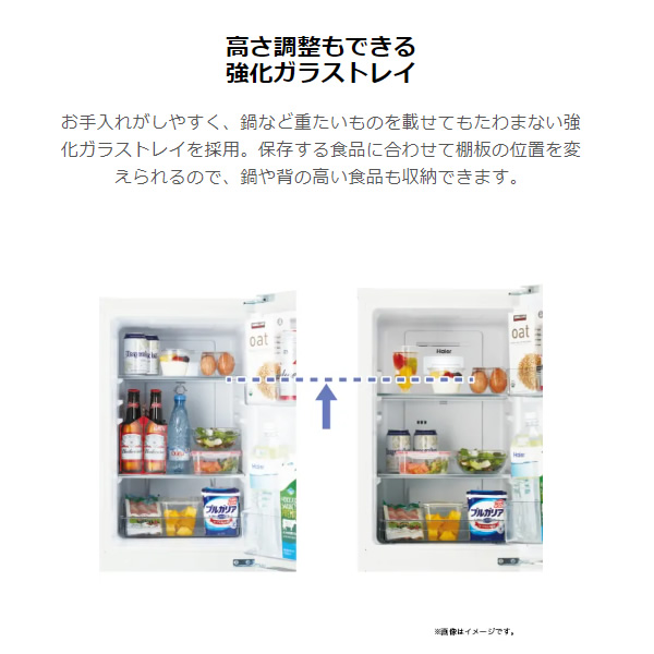 お手入れがしやすく、鍋など重たいものを載せてもたわまない強化ガラストレイを採用。保存する食品に合わせて棚板の位置を変えられるので、鍋や背の高い食品も収納できます。