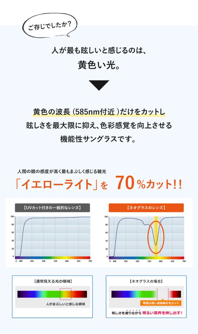 日米特許を取得した ネオグラス は、特殊技術により レンズ に技術により人が最も眩しいと感じる黄色い光の中でも585nmの波長のみを、選択的に最大70%以上カットし、眩しさを抑える効果があります( イエローライトカット )