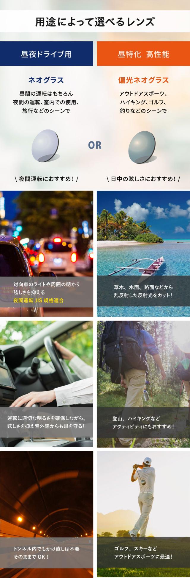 夜間、或いは雨、霧、曇りの天候の際に着用頂くことで 視認性 が良くなります。特に ドライブ の際は標識や信号、歩行者などが見やすくなります。また 夜間の運転にも効果的で、対向車の ライト 、街灯、ネオンなどの強い光を緩和する効果が期待でき、運転の安全性が高いと考えられます。もちろん、日差しの強い日中もお使い頂くことができ、眩しさを低減するとともにし 紫外線 から目を守り(UVカット率は約100%) 眼精疲労 や 眼の疲れ からくる 頭痛 も抑えられたとのお声も頂いております。