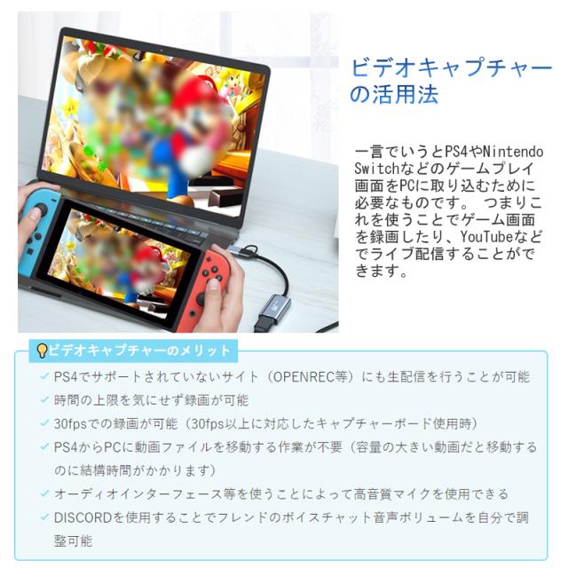 ビデオキャプチャー hdmi to usb2.0 キャプチャーボード ビデオキャプチャーケーブル Mac PS4 Nintendo SWITCH OBS対応 4Kビデオをデータ化 オンライン配信 会議