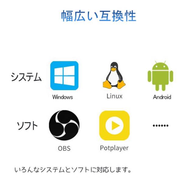 対応ソフト:open broadcaster software,XSplit,facebook,youtube,instergram,Potplayer,AMcap,VLC,Skype,Googleハンドアウト,ニコニコ動画等