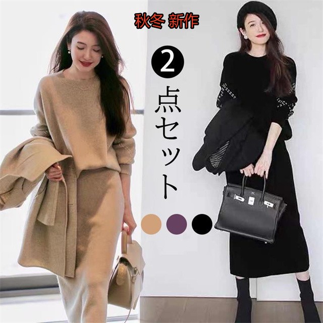 ニットワンピース セットアップ レディース 秋冬 長袖セーター スカート ワンピース きれいめ 大きいサイズ オシャレ 膝丈 通勤 着痩せ 2色 二次会 入学式 新作