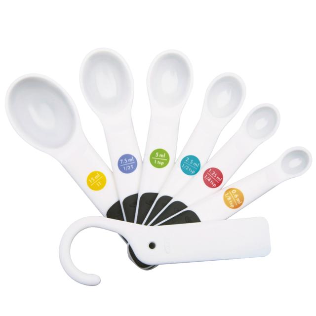 6種類のスプーンとフック兼スクレーパーのメジャースプーンセットです。スナップ式で着脱がワンタッチなので、目的のスプーンを取り出すのも簡単です。カラフルな容量表示で見やすくスムーズに調理できます。