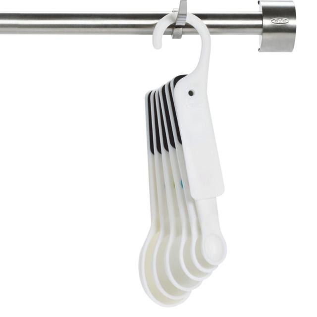 大さじ1、大さじ1/2、小さじ1、小さじ1/2、小さじ1/4、小さじ1/8、スクレーパ(兼フック)のセットです。フック掛けできるので収納に便利です。