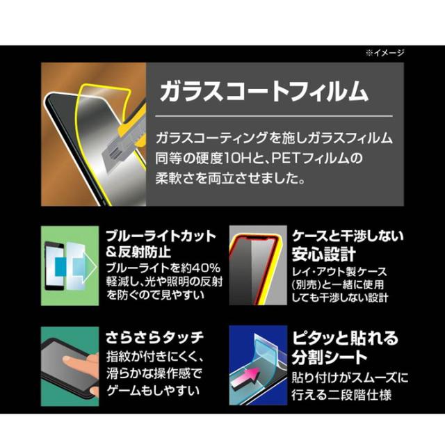 ガラスコーティングを施し、ガラスフィルムと同等の硬度10Hと、貼り直しの際に割れる心配のないPETフィルムの柔軟さを両立。