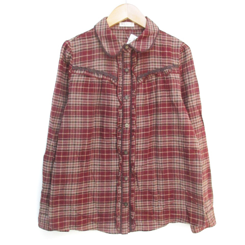 【中古】未使用品 アクシーズファム カジュアルシャツ ブラウス 長袖 フリル チェック柄 M 赤 ベージュ レディース