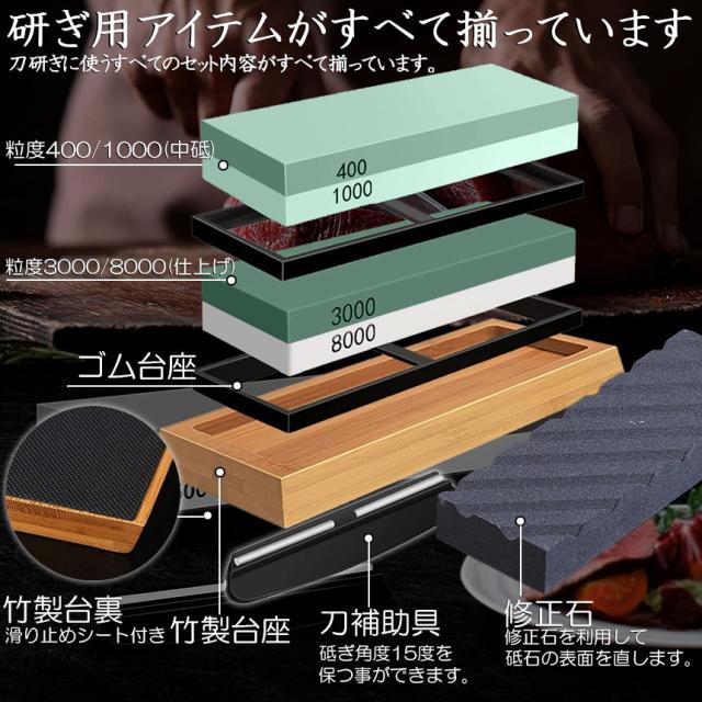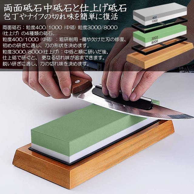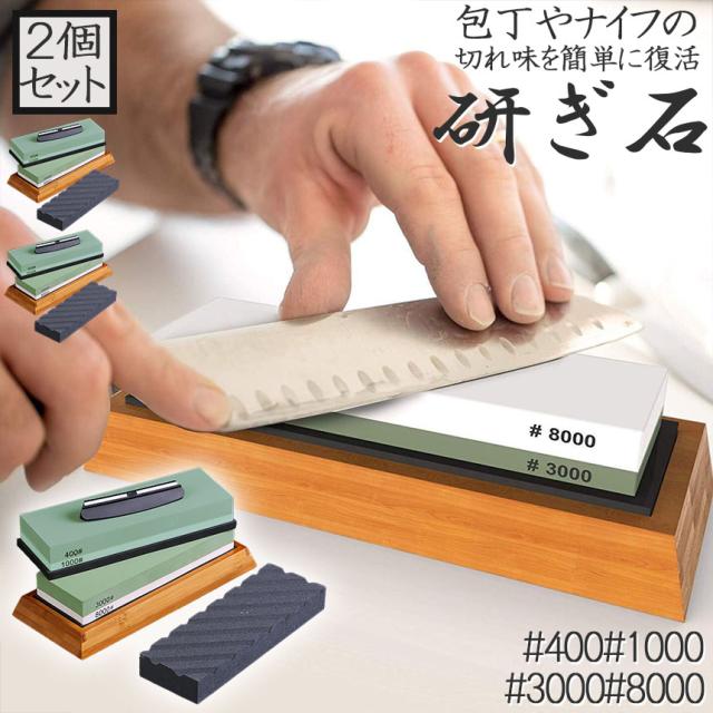 研ぎ石 2個セット 包丁 両面砥石 #400 #1000 #3000 #8000 砥石 刃物砥石 包丁研ぎ砥石 包丁研ぎ器 中砥石 仕上砥石 包丁研ぎ 包丁砥石 刀補助具 竹台座 ゴム台座 面直し 付き 家庭用 料理人用 包丁 サバイバルナイフ 彫刻等セット 日本刀 はさみ