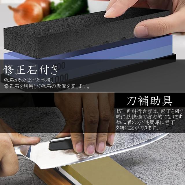 【両面砥石】砥石に書いてある「400/1000」や「3000/8000」などが粒度になります。「400/1000」を「中砥石」、「3000/8000」を「仕上げ砥石」と呼びます。通常包丁を研ぐ時は中砥石と仕上げ砥石最低でも2種類の砥石が必要です。両面砥石は中砥石「400/1000」と仕上砥石「3000/8000」が揃ったセットになります。中砥石は切れ味が悪くなった時に使います。一般のご家族なら中砥石があれば十分です。仕上砥石はより良い切れ味を追求したい時に使います。砥石にさまざまな粒度があるのは、包丁の状態によって使い分けた方が効率がいいからです。【滑り止めゴム付き竹製台】竹製台がついている砥石です。高さがあるので研ぐ時に手にぶつかりません。また、砥石が薄くなっても台についているので割れ にくくなっています。砥石を載せるとしっかり固定されるようになっています。竹製台には滑り止めゴムが付いており、しっかり固定して作業が出来ます。