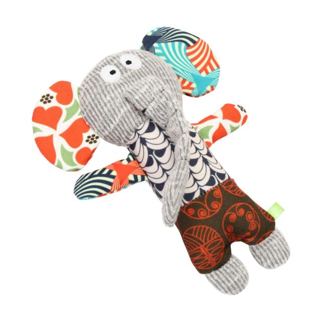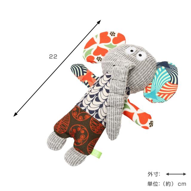 ゾウのぬいぐるみ系犬用おもちゃです。ふわふわとした灰色部分の生地と、胴体部分などは硬めの生地でひとつのおもちゃの中にも手触りに変化があります。スクィーカー入りなので、音を鳴らしてワンちゃんの興味を引くこともできます。ワンちゃんが喜ぶツボを押さえた仕掛けがたくさんです。