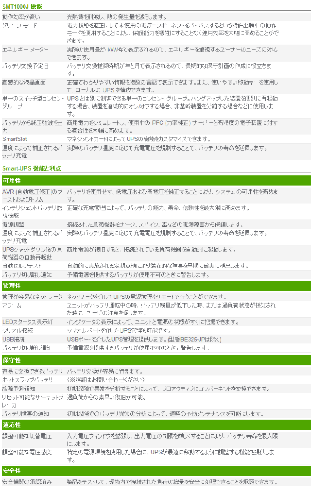 | UPS(無停電電源装置) APC Smart-UPS 1000 LCD 100V 5年保証付き SMT1000J5W スペック情報 | |