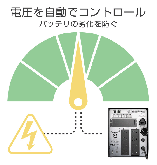 LCDディスプレイ、高効率グリーンモード、AVR機能(自動電圧調整機能)、出力コンセントグループのON/OFF機能付き、長寿命バッテリを搭載したUPS。
