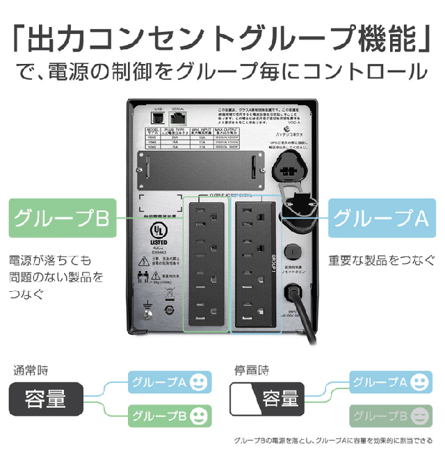 1000VA 以上の容量のモデルは出力コンセントグループ毎に、オン/オフ、シャットダウン、リブート(シャットダウンとリスタート)など詳細な電源管理が可能です。