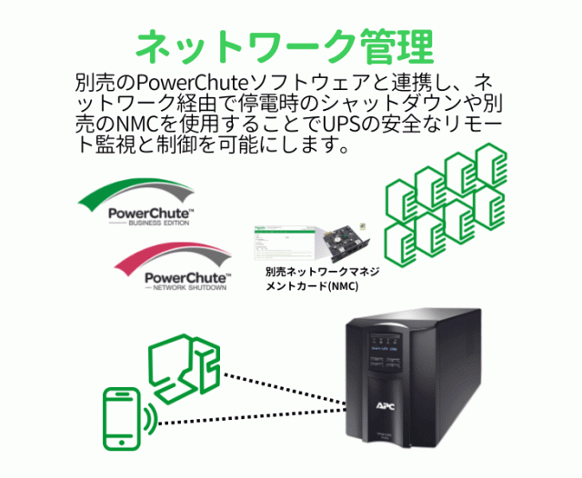 別売りのPowerChute Network Shutdownソフトウェアと連携し、ネットワーク経由でUPSの監視、通知、停電時のシャットダウンが可能となります。