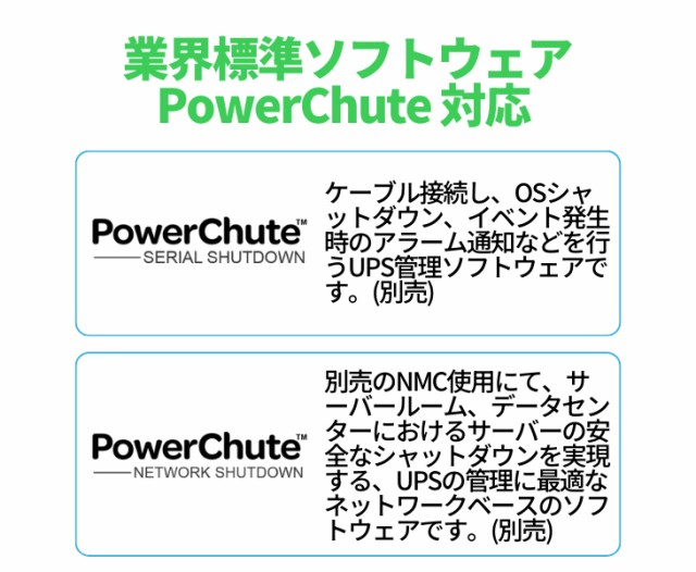 PowerChuteビジネス版(別売)は、UPSとサーバー機器間を専用シリアルケーブル接続し、OSシャットダウン、イベント発生時のアラーム通知などを行うUPS管理ソフトウェアです。