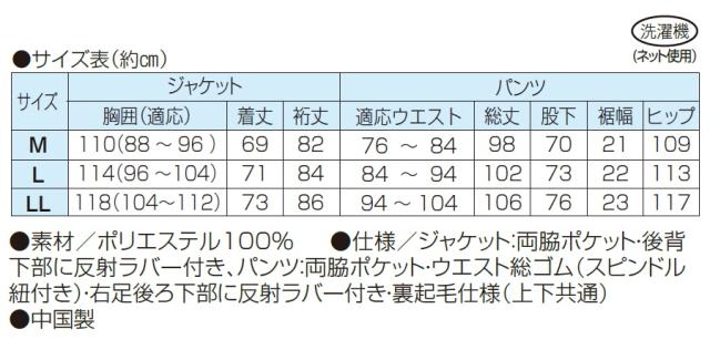 ●仕様/ジャケット:両脇ポケット・後背下部に反射ラバー付き、パンツ:両脇ポケット・ウエスト総ゴム(スピンドル紐付き)・右足後ろ下部に反射ラバー付き・裏起毛仕様(上下共通)