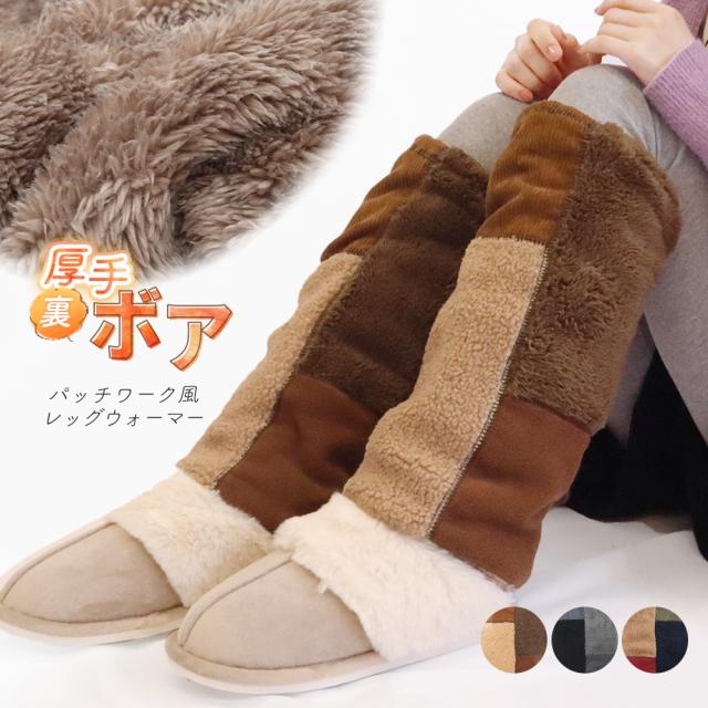 レッグウォーマー 裏ボア パッチワーク風 ロング 調節ゴム付き あったかい 暖かい おしゃれ 防寒 *00