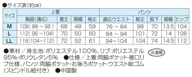 ●仕様/上着:両脇ポケット・裾口リブ仕様、パンツ:両脇ポケット・右後ろポケット・ウエスト総ゴム(スピンドル紐付き)