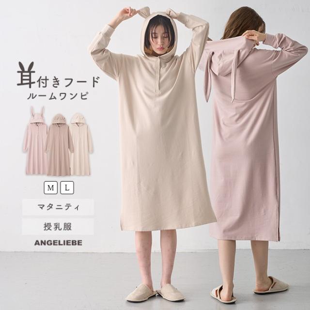 マタニティ パジャマ ワンピース 授乳服 ルームウェア 秋冬 長袖 マルチ WAY ストレッチ ルームワンピ 伸びる ストレッチ うさ耳 くま耳 かわいい おしゃれ アイボリー ピンク モカ 妊婦 妊娠 春 秋 冬 出産 産前 産後