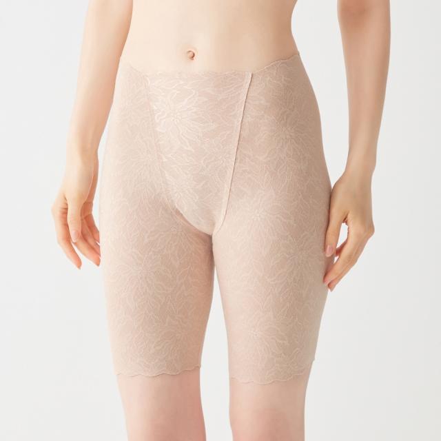 生地端にゴムが無いカットオフのストレッチレースを使用しています。肌あたりが柔らかな素材なので、レース特有の凹凸を感じにくく、フラットな着用感です。ストレッチレースのほどよいパワーがカラダにフィットしますが、肌への圧迫感は少なく、おなかとヒップまわりを優しく補整します。ヒップ下に段差ができにくいので、痩せ見え効果も。カラダのラインをひろうボトムを着用する時にもおすすめです。