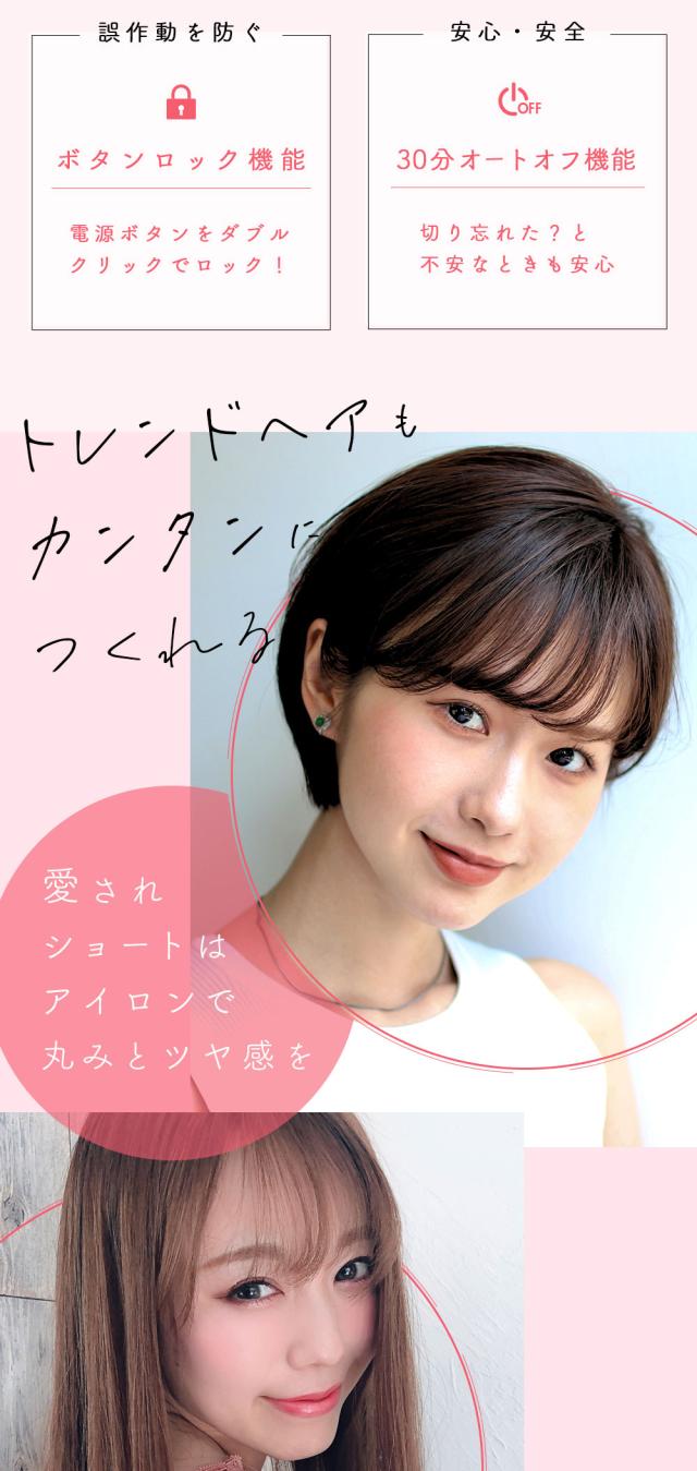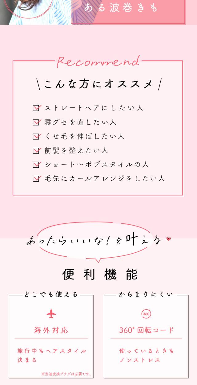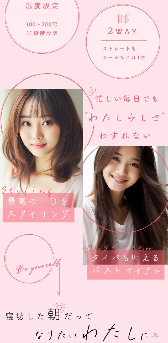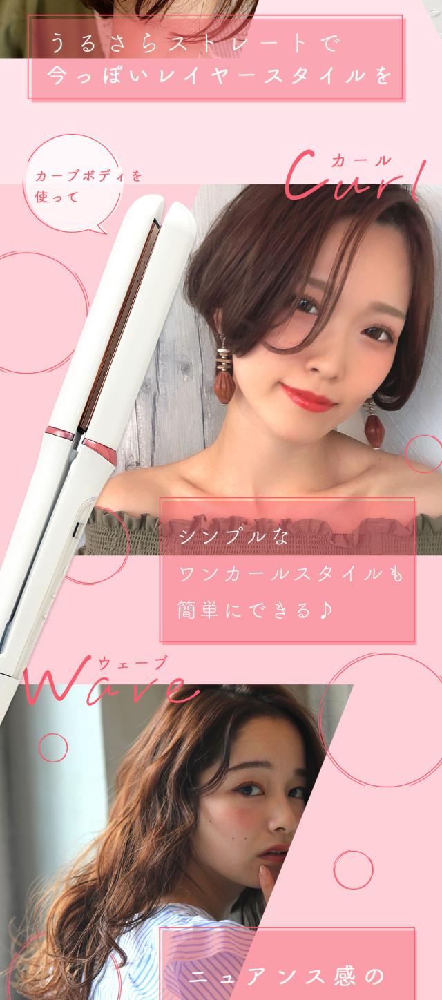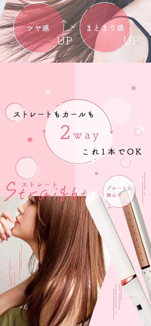 2Wayスタイル: ストレートヘアもカールヘアもこれ1本でOK。うるさらストレートやワンカールスタイル、波巻きが簡単に作れます。