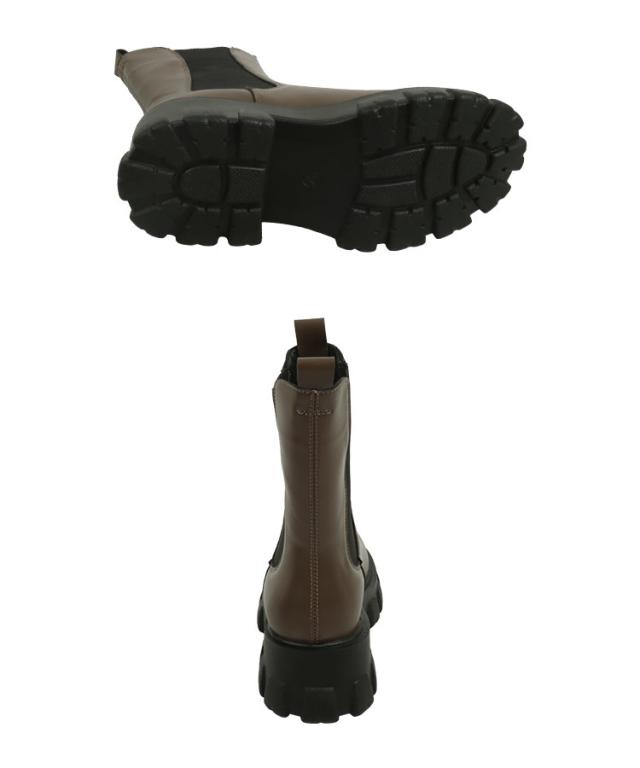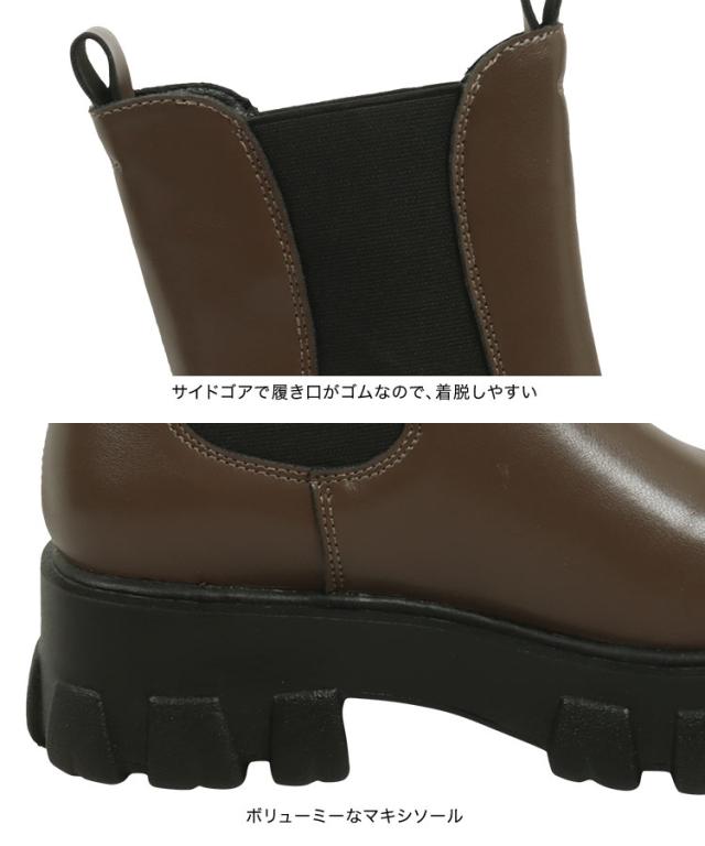トレンドのサイドゴアブーツの登場。ボリューミーなマキシソールに上品な印象のフェイクレザーの組み合わせ。履き心地もよく、たくさん歩いても疲れにくいようクッションを仕込みました。【素材・サイズ感】雨などの汚れもお手入れしやすいフェイクレザー素材。厚底のマキシソールで履くだけで盛れるのも嬉しいポイント。サイドゴアで履き口がゴムなので、着脱しやすいのも魅力のひとつ。※キャンセル/変更不可※お届けまでの日程について