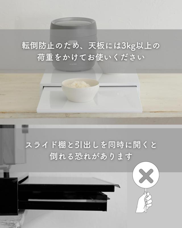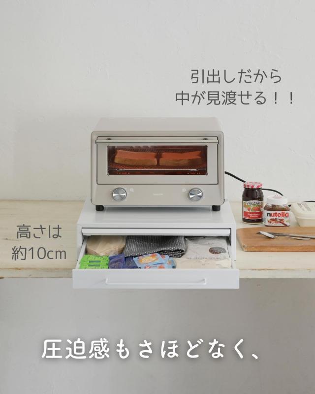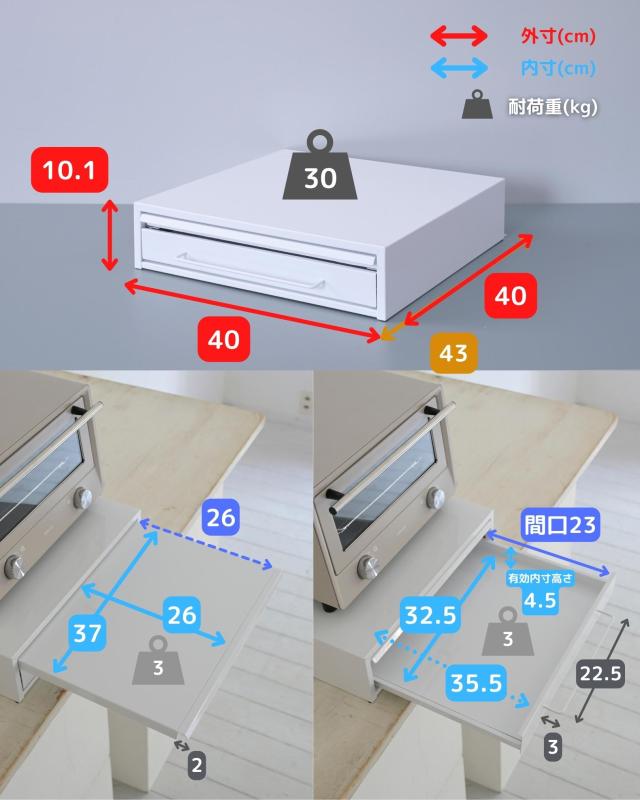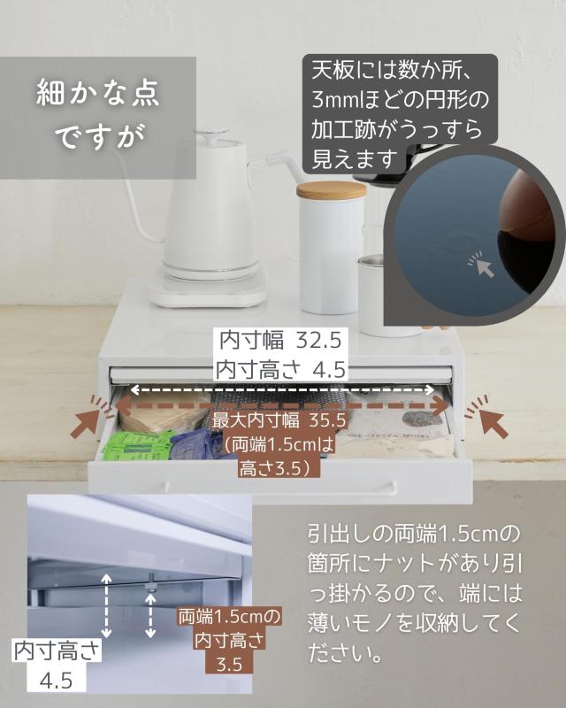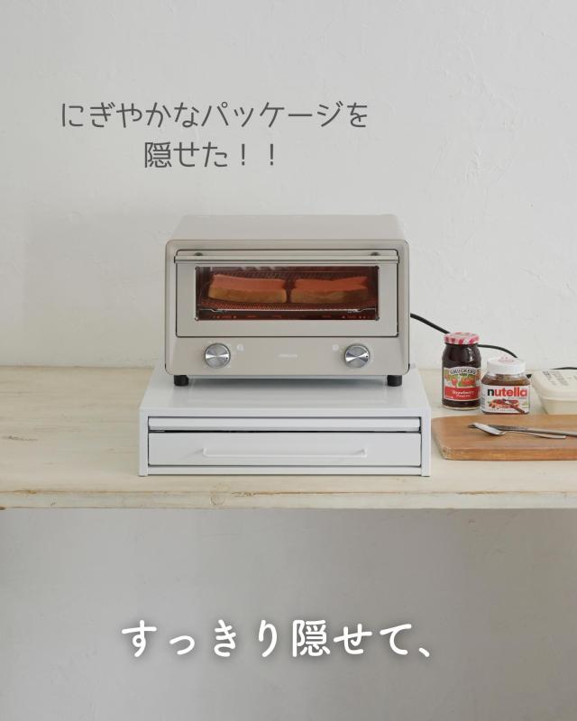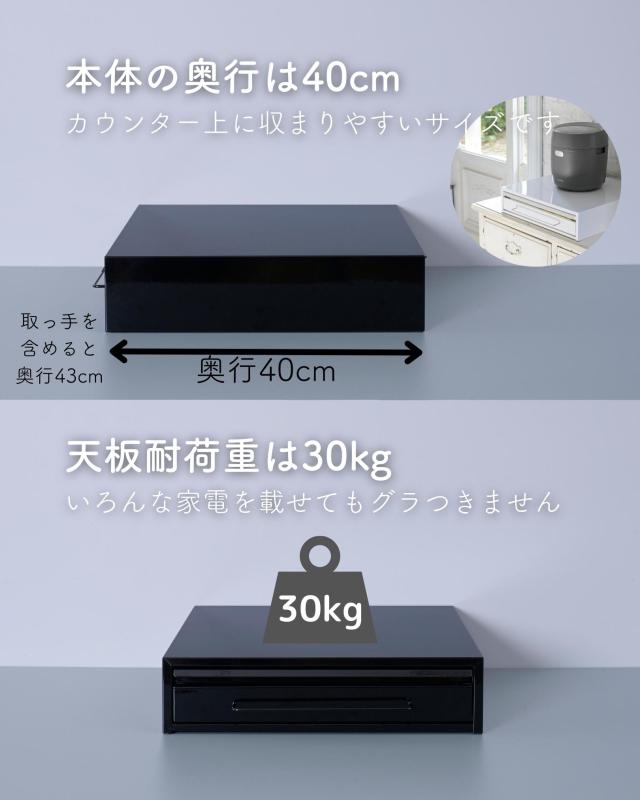 | 商品説明 | ●取っ手も取り付け済み、完成品でお届け ●キッチン家電の下を活用した隙間収納アイテム ●さらに、作業スペースが作れるトレー台付き ●使わないときも邪魔にならない、出し入れできて便利なスライド式 ●浅型引出しは、スイスイ開閉できるコロレール付き ●浅型引出しは、ラップやアルミホイルを(横置き)可能な深さ約4.5cm ※両端1.5cmの箇所の内寸深さは約3.5cm ●引き出しはコロレール付き、ストッパー付き、スライド幅約24cm ●取っ手(約) 幅30.5 奥行3cm、ワイヤー溶接式 ●接地面(約) 幅12 長さ400mm ●四隅にズレ防止ゴムシール(黒色) ▼幅40cm ●炊飯器やトースター置き場を活用する、スリムな横幅40cmタイプ ●天板: 幅40 奥行40cm、耐荷重20kg ●スライド棚: 幅37 奥行26cm、耐荷重3kg ●スライド棚持ち手出っ張り+2cm未満 ●スライド棚はレールなし、ストッパー付き、スライド幅約26cm ●引き出し内寸: 幅32.5(最大35.5) 奥行35.5/間口奥行23 有効深さ4.5cm |