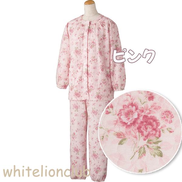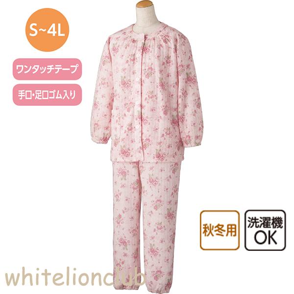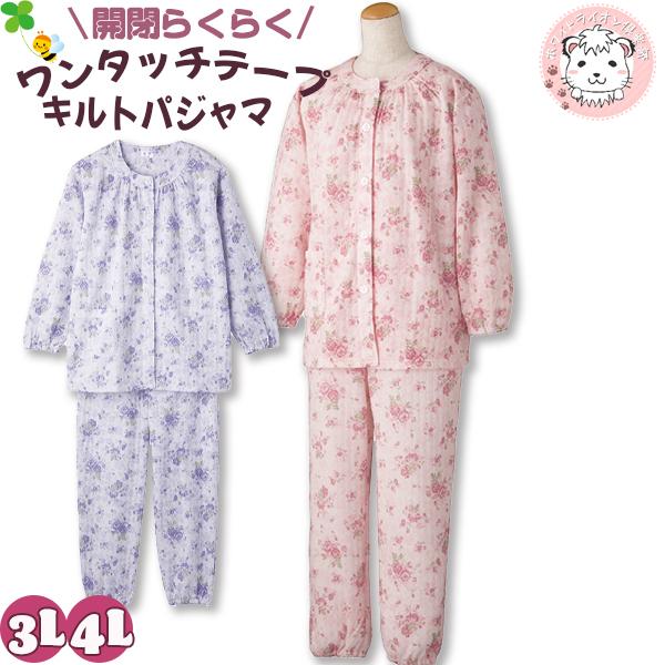 【アウトレット】ワンタッチ キルトパジャマ レディース 長袖 ワンタッチテープ 前開き 全開パジャマ 介護パジャマ 手首 足首ゴム入り かわいい 3L/4L