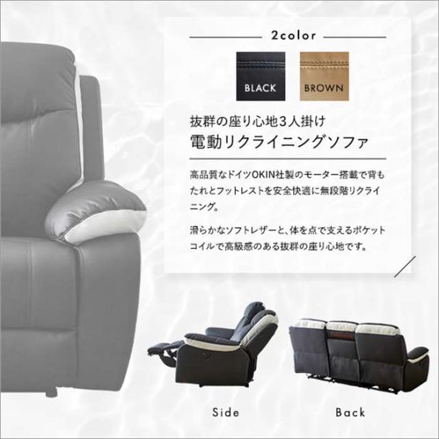 抜群の座り心地!3人掛け電動リクライニングソファ。カラーは、ブラック(4535306212575:SH-24-ESL-3--BK)、ブラウン(4535306212582:SH-24-ESL-3--BR)、です。座り心地抜群!3人掛け電動リクライニングソファ、2色からお選びいただけます。ドイツのOKIN社製のモーターをしており、安全な無段階リクライニングで快適に過ごせます。ひじ掛け横のボタンで、フットレストと背もたれをリクライニングすることができます。真ん中の座面を倒すとテーブルになっていますので、ちょっとした飲み物や本などを置いておくのに便利です。高級感のあるソフトレザーの張地がお部屋に高級感をもたらします。