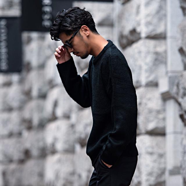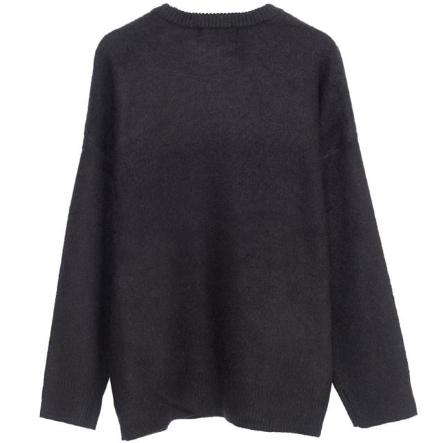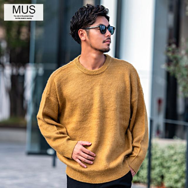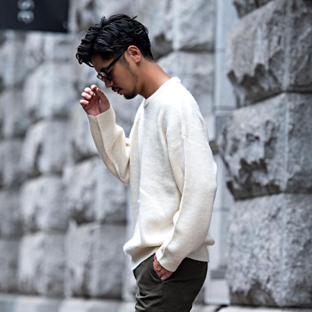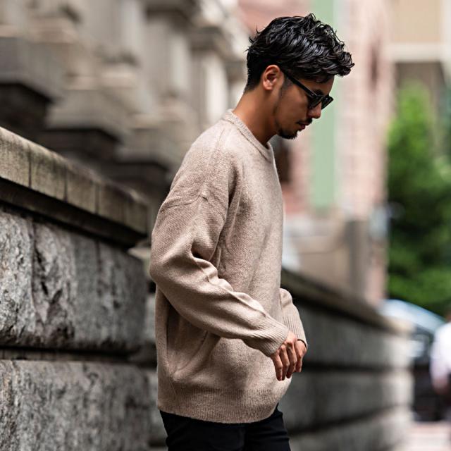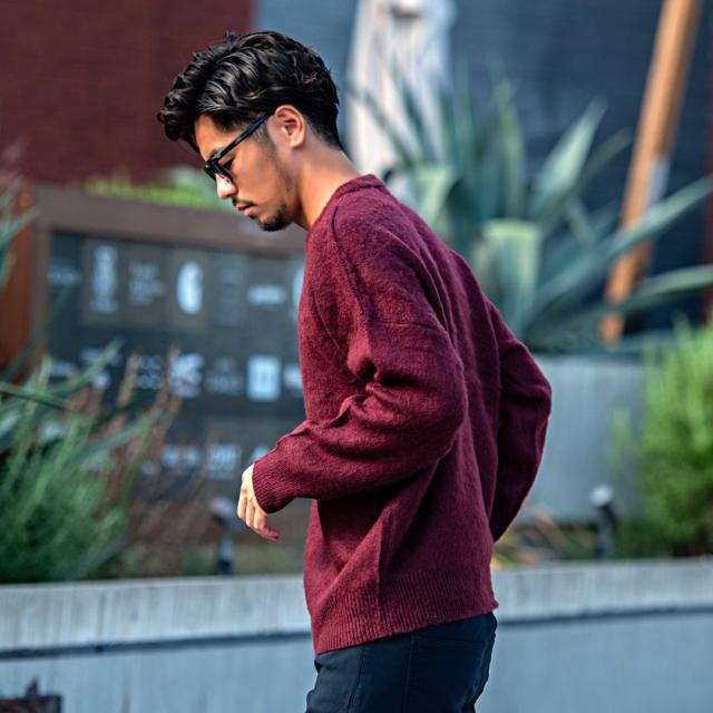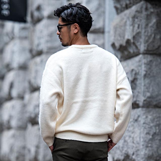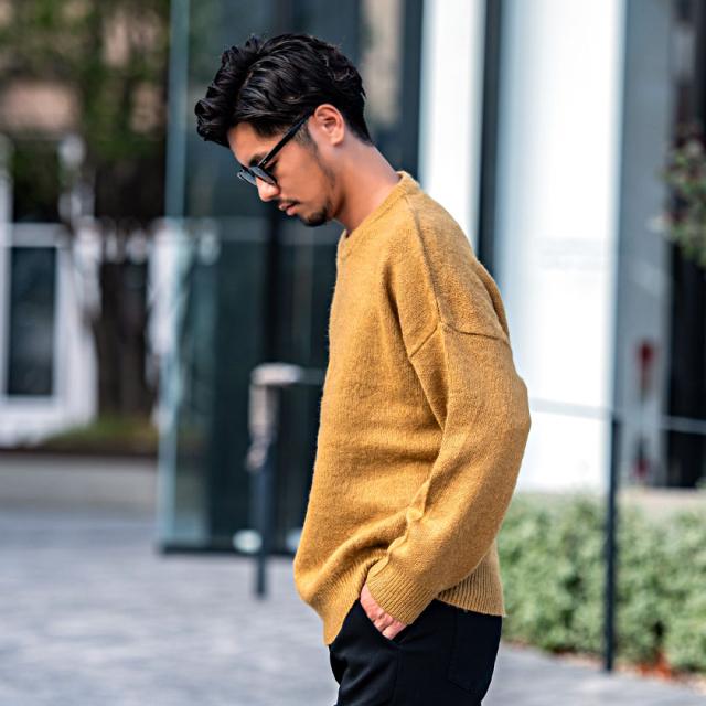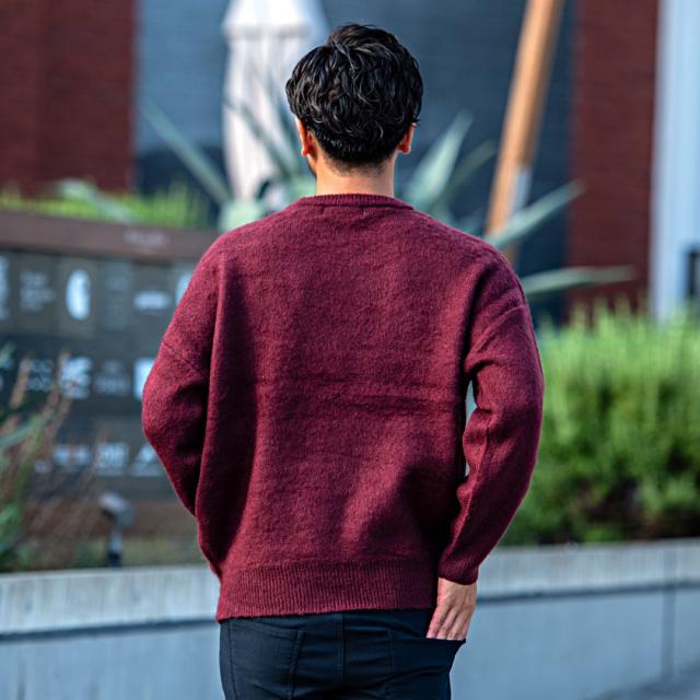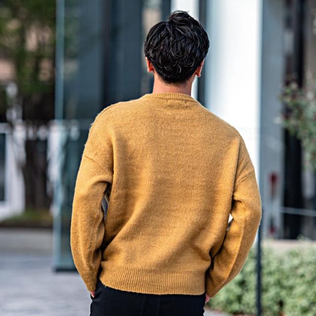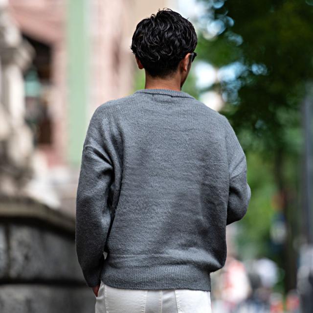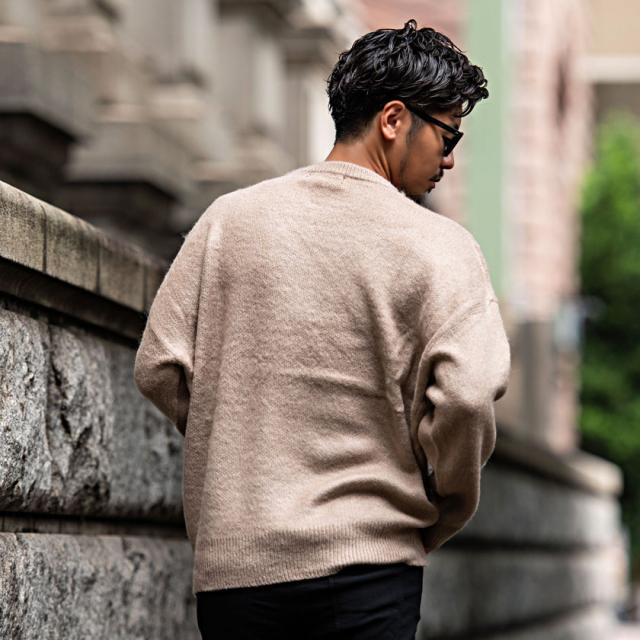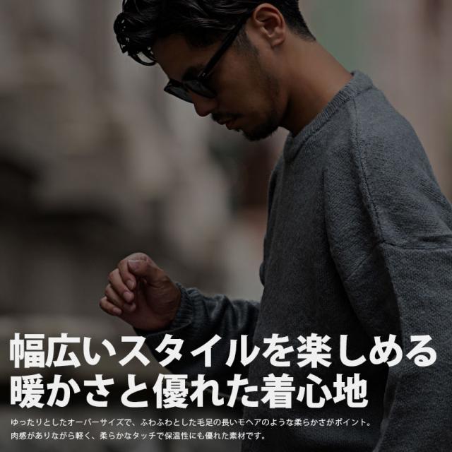 ゆったりとしたオーバーサイズで、ふわふわとした毛足の長いモヘアのような柔らかさがポイントのクルーネックニット。