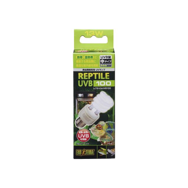 本体サイズ(幅X奥行X高さ):4.5×4.5×12cm<br>ケージ内で自然に近い明るさを再現する<br>原産国:中華人民共和国<br>砂漠・サバンナに棲息する爬虫類にとって適用なUVBを照射するランプ<br>本体重量:70g<br>熱帯・亜熱帯に棲息する爬虫類に適したUVBを照射するランプです。<br>◆商品名:エキゾテラ GEX EXOTERRA レプタイルUVB100 13W PT2186 熱帯・亜熱帯 爬虫類用 紫外線ライト 熱帯・亜熱帯に棲息する爬虫類にとって最適<br>商品紹介<br>熱帯・亜熱帯に棲息する爬虫類にとって最適なUVBを照射するランプ。 爬虫類には紫外線の照射が必要です。 多くの爬虫類は自然界で太陽光に照らされて生活しています。太陽光には紫外線(UV)が含まれており、紫外線を浴びることで新陳代謝が行え、生命活動を維持できます。 飼育下で不足がちな紫外線を人工のランプで補う必要があります。 ケージ内で自然に近い明るさを再現するためにナチュラルライトとの併用をお薦めします。 照射効果を確実にするために、一年を目安に交換してください。 飼育できる爬虫類の一例:パンサーカメレオン、ウォータードラゴン、グリーンイグアナ、ヒルヤモリ、ホシガメ、ロシアリクガメ、ギリシャリクガメ、アカアシガメ、水棲ガメ全般など 口金:E26 消費電力:13W ※コンパクト、ライトドームに取り付けてご使用ください。<br>使用上の注意<br>※本製品は屋内爬虫類飼育専用です。他の目的では使用しないでください。※生体やディスプレイ、飼育ケージ(プラスチックフレーム、ガラス)などに直接触れないように設置してください。※必ずランプの口金(E26)に適合した器具を使用してください。※水滴がかかる状態では使用しないでください。※ガラス製品ですから、ぶつけたり、無理な力を加えたり、傷をつけたりしないでください。※ランプを併用するときは、ランプ同士を離して設置してください。<br>原材料・成分<br>ガラス、他<br>使用方法<br>爬虫類・両生類飼育専用の照射器具(コンパクト、ライトドーム)に取り付けてご使用ください。<br>必ずお読みください<br>※製品の仕様、デザイン、価格等予告なく変更することがあります。
