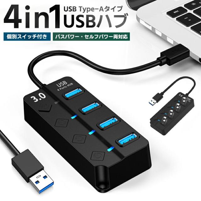 USBハブ hub 4ポート USBポート増設 電源不要 個別スイッチ データ転送 USB3.0 USB2.0 拡張 小型 5gbps 挿すだけで使える バスパワー