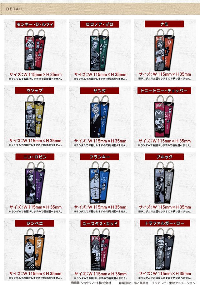 | バリエーション | 全12種類 モンキー・D・ルフィ ロロノア・ゾロ ナミ ウソップ サンジ トニートニー・チョッパー ニコ・ロビン フランキー ブルック ジンベエ ユースタス・キッド トラファルガー・ロー ※ランダムでお届け致しますので、種類は選べません。上記の12種のいずれかが封入されております。 |