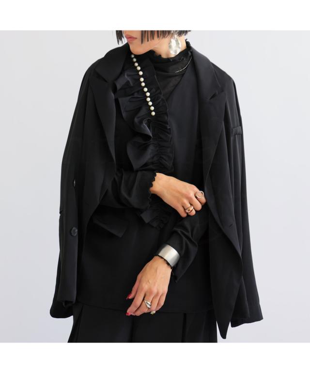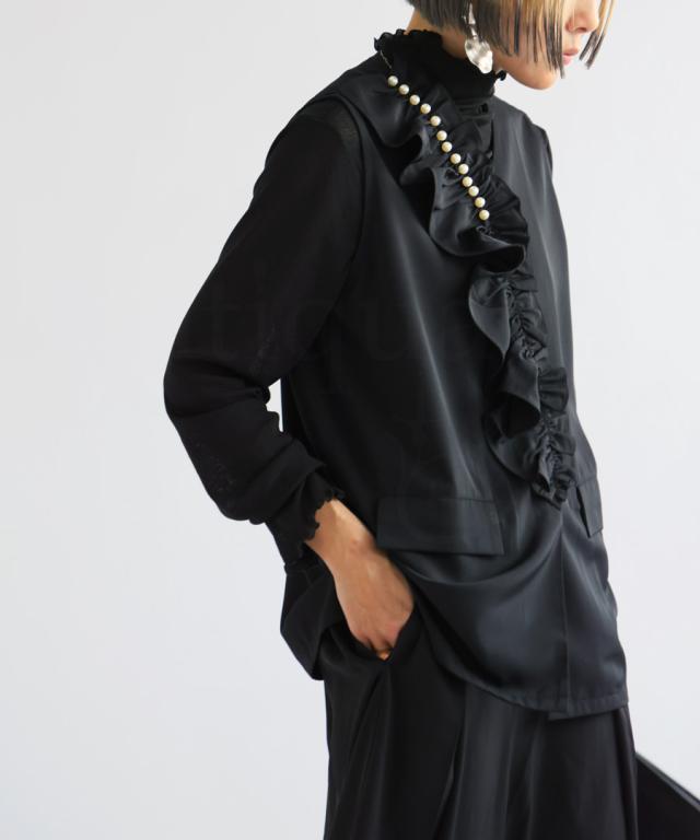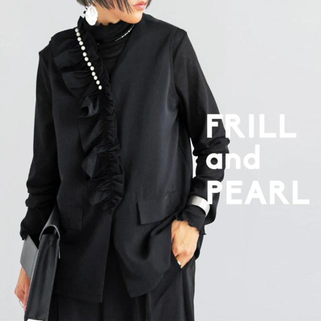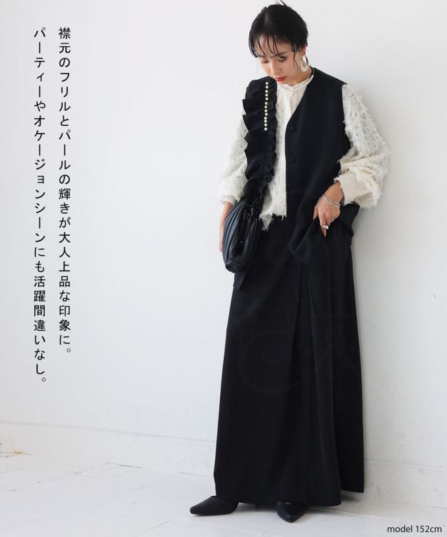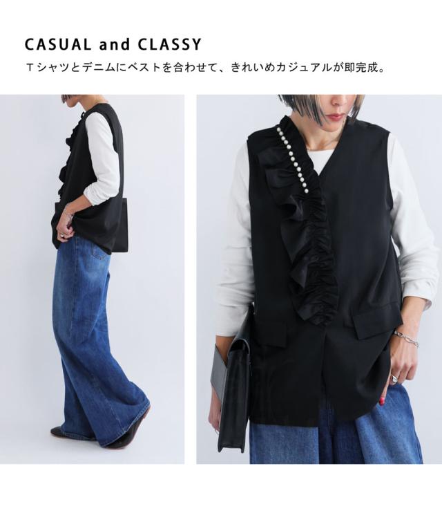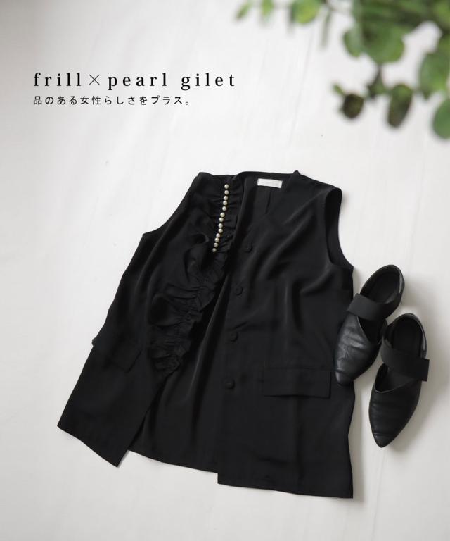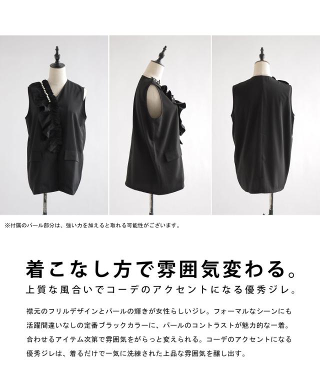 襟元のフリルデザインとパールの輝きが華やかな、上品な雰囲気醸すジレ。