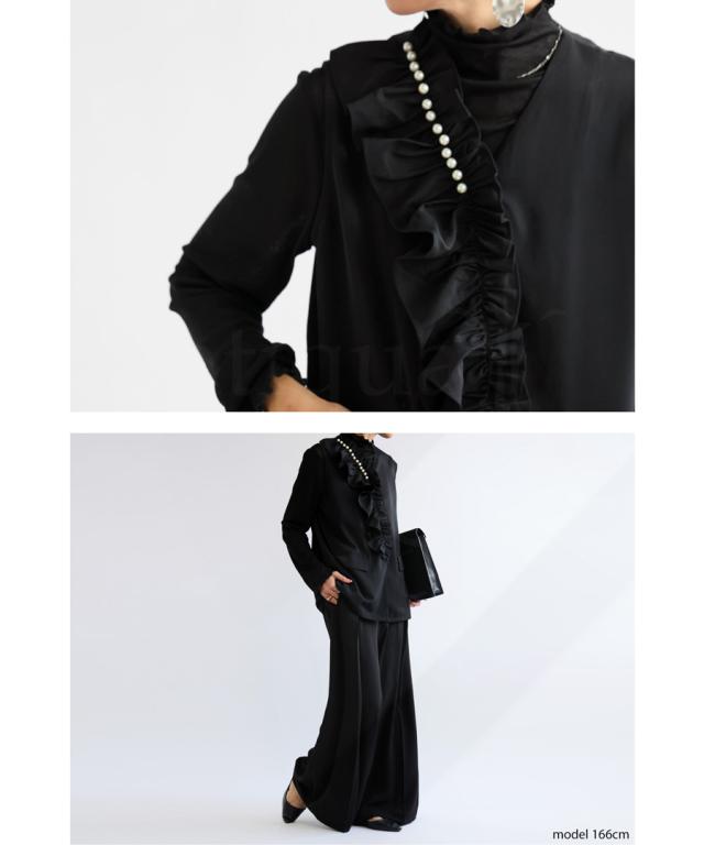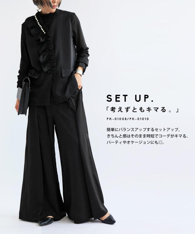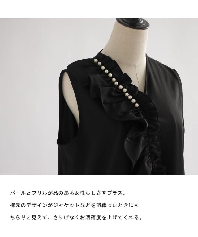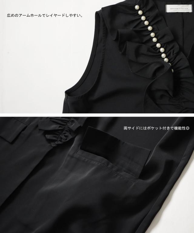 pk-01008 フリル パール きれいめ 上品 Vネック セットアップ ゆったり ベスト 高級感 レイヤード 重ね着 ノースリーブ アシメ アシンメトリー ポケット付き 着痩せ 細見え