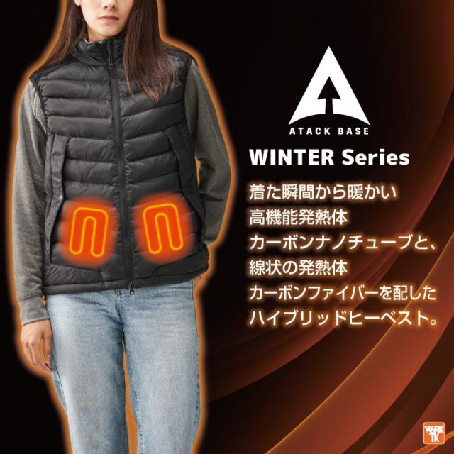 アタックベース 電熱ベスト バッテリー付き ヒートベスト ヒーターベスト 電熱ウェア 防寒ベスト 冬 暖かい メンズ レディース 仕事服 作業着 夜間作業 アウトドア キャンプ 登山 釣り スキー ブラック カーキ 大きいサイズ at-70000-b