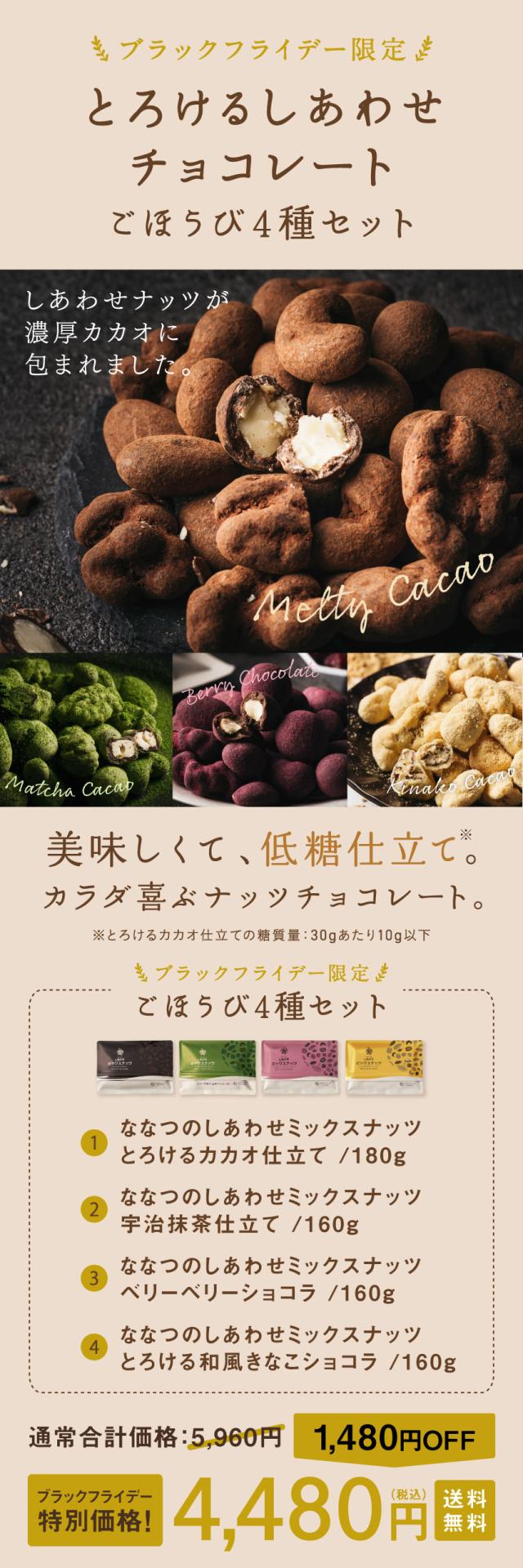 【2025ブラックフライデー限定!】とろけるしあわせチョコレート ごほうび4種セット しあわせミックスナッツチョコ4種セット(カカオ・ベリー・抹茶・きな粉) 送料無料 チョコ ミックスナッツ 期間限定 お菓子 ホワイトチョコ ギフト ご褒美