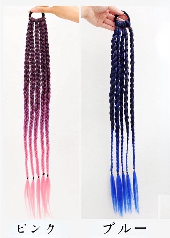 三つ編み エクステ ウィッグ ロング 編み込み グラデーションカラー カラフルイメチェン ゴム ダンス イベンド コスプレ 子供 大人 ツインテール つけ毛