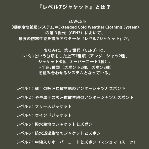 ECWCS(Extended Cold Weather Clothing System:拡張式寒冷地被服システム)では、